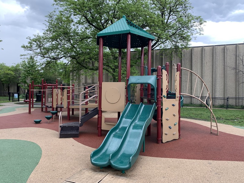 Bromann Park - Playground ParkBromann Park is a busy park on a busy corner of Chicago that fits a lot of equipment and amenities into a very small site. There is a standard set of swings, a collection of climbing/traversing elements, and a moderate size play structure accessible via a ramp. The amenities are solid: there are benches and picnic tables in the fully enclosed play area as well as a drinking fountain. The play surface is soft rubber and there is a lovely mural on the wall forming the north side of the park. All in all, this is a great little park - highly recommend.