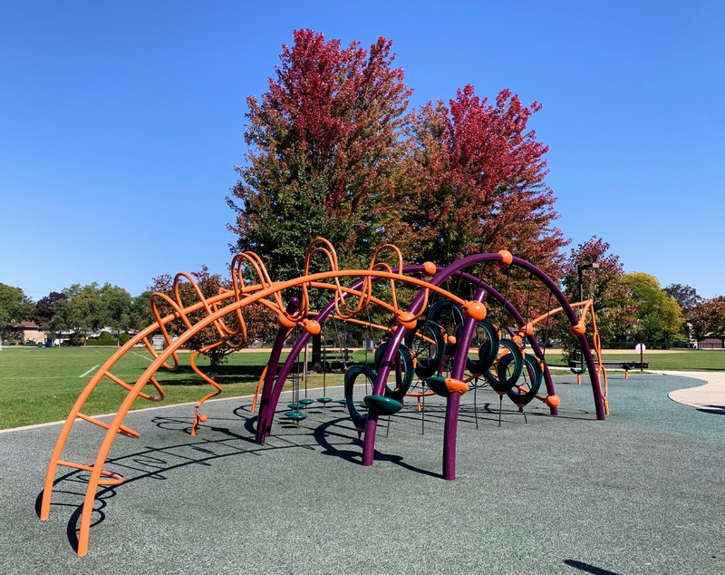 Edgebrook Park - PlaygroundThis playground sits between Edgebrook Park and the local Chicago Public School (called, of course, Edgebrook Public School) and this seems like a shared asset between both organizations (i.e. might be used exclusively by school children during school days and not a great location for an outing with younger children during the school year). Despite this preamble, this is a great little playground. There is a modern collection of climbing elements for older children and a smaller, more traditional structure, for younger children. The surface is soft rubber and there are a few benches and trees around the perimeter creating a nice ambiance. Overall, this is a solid playground worth visiting on a non-school day!