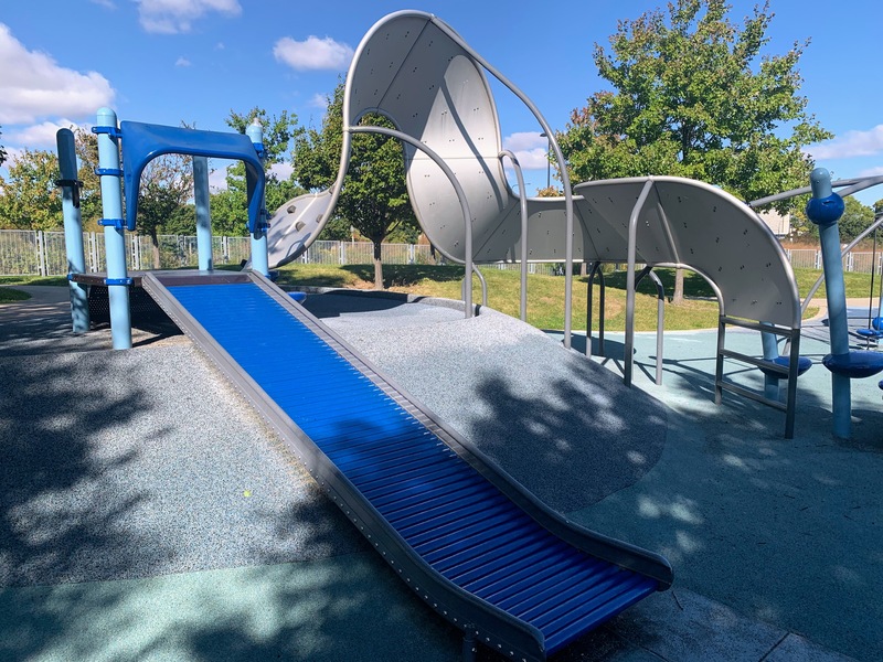 Another absolute gem of a playground. The playground is packed with interesting and unique elements and sloping terrian. The rest of the park is an interesting oasis in the city. And the misting fountains are one of the best water spray features in the city.