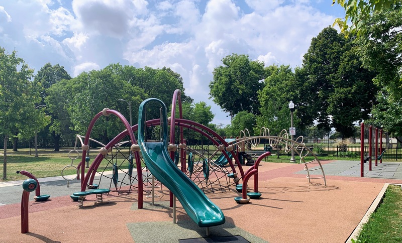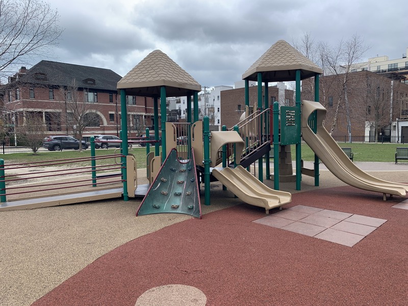 Washington (George) Park - Northwest PlaygroundThis playground - one of four in Washington Park - was renovated in 2022 and is a wonderful playground. It includes a single large play structure, a large set of swings, a few standalone elements, and a water spray feature. The structure has a nature theme and features a variety of slides and climbing elements. The swing set includes the standard swings: toddler, adaptive, and belt seat. The swing set also includes two 'double swings' - one with two belt seats and one with a belt seat and a toddler seat. The standalone alone elements include some interesting musical elements and the water spray element is a 'loch ness mister' and an spray element shaped like a flower. The entire area is enclosed and features nice amenities like benches, picnic tables, a drinking fountain (with a bottle filler!), and a bike rack. Washington Park is a beautiful setting and the area is surrounded by tall trees; these trees provide some shade but the play area is also quite open and sunny. All in all, this is a great playground and worth checking out - highly recommend.