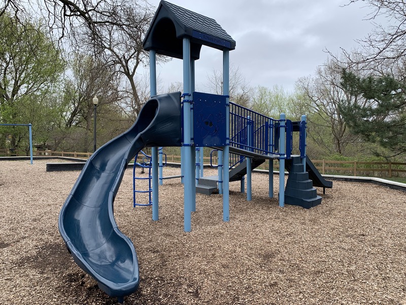 Chi Che Wang Park - PlaygroundTucked beside the Metra Track off a quiet side street, this small playground is the only feature in Chi Che Wang Park. Surrounded by a large grassy space without trees or athletic fields, this playground features a soft rubberized surface and smaller elements best suited for younger children. There are some unique climbing animals (an elephant and gorilla) and the standard offerings of swings. The large, open grassy area and the relative quiet - broken only by a passing Metra Train - are the defining features of this playground.