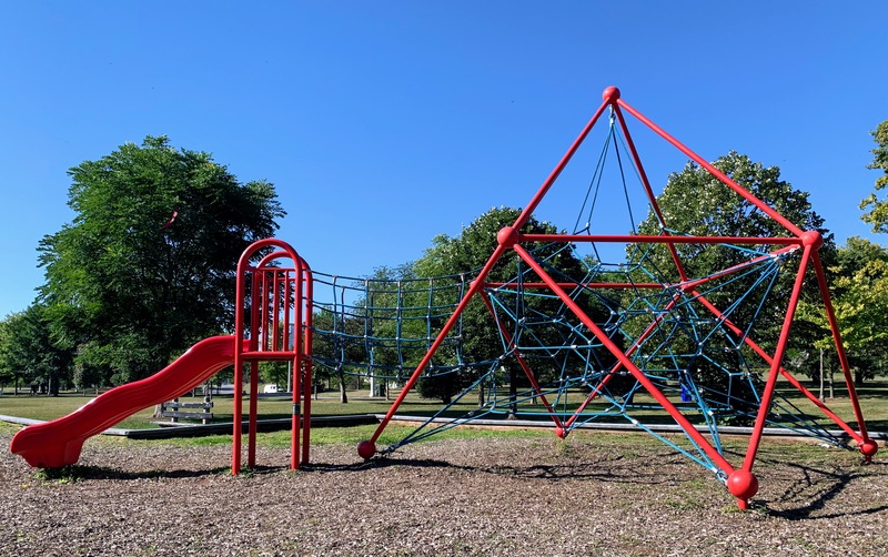 Howard Beach Park - PlaygroundThis small playground features a large net climbing structure with a rope bridge leading to a curving slide, a hammock saucer swing, and a large spinning conical climber. The play area is somewhat enclosed and is the play surface is wood chips. There are a few benches near the playground and provides unobstructed views of Lake Michigan.