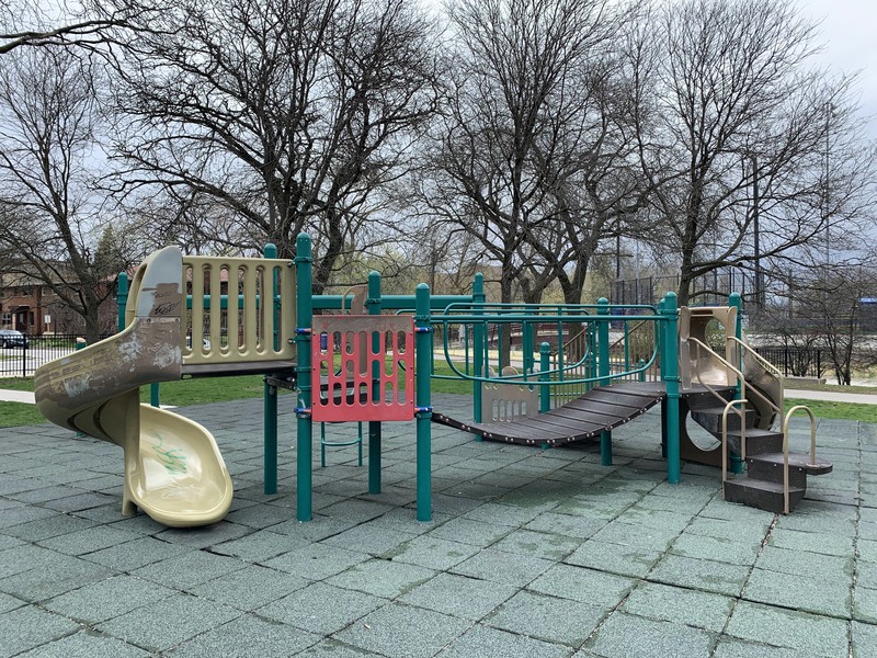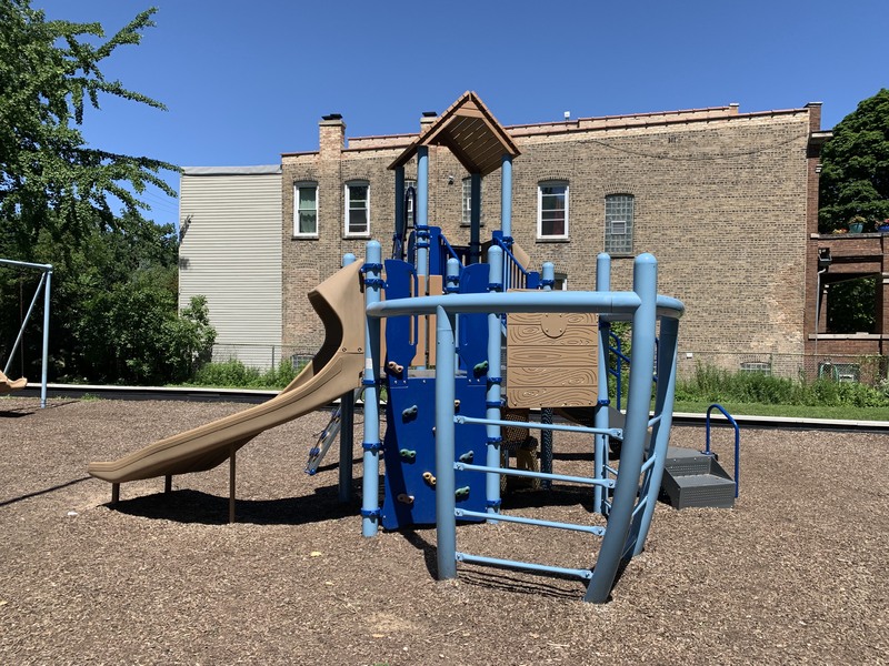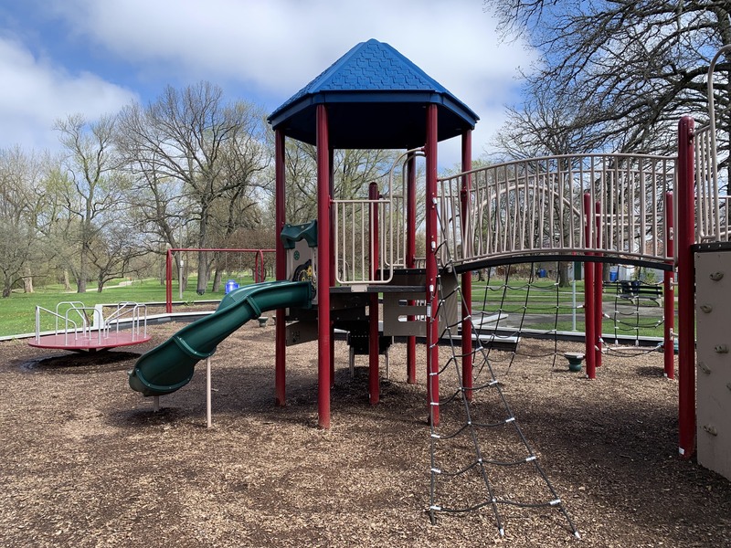 Wieboldt Park - Playground ParkThis small and shady park features a variety of unique equipment. There are two areas with swings, another area designed for older children, and another area for younger children. The play area is large and consumes nearly the entire small site. The Metra tracks are immediately to the west of the playground and the passing of trains interrupts the general quiet of the neighborhood. The surface is wood chips and there are two benches.