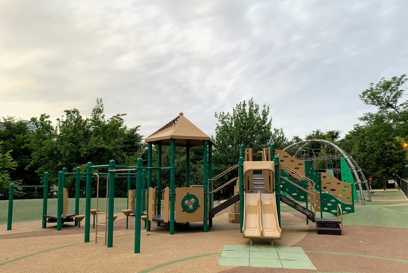 Ping Tom Memorial Park - PlaygroundPing Tom Park is one of the best parks in Chicago and the playground, while somewhat standard, does not disappoint. It contains two play structures and a number of small, standalone elements, as well as swings and seating. The smaller play structure is designed for younger children and is quite small and accessible. The larger structure is somewhat sprawling and including a variety of elements: monkey bars, climbing elements, slides, and more. No element is truly remarkable or unique but the entire play structure is above average. There are a few unique standalone elements and a standard set of swings. The play area is entirely enclosed and the playground set near the middle of the park and is removed from cars and traffic. However, this park is near three (3!) active train lines including the CTA Orange Line, Metra and Amtrak trains (which cross the South Branch of the Chicago River on a bridge) and an active freight train line. So despite the distance from cars and traffic, this is playground has great views of trains and river traffic. The play area contains a number of benches and picnic tables and is shaded by several large trees making it a comfortable to sit and gather. The surface of the playground is soft rubber. Outside the playground, this park has other amenities worth exploring as a family: a large pagoda near the river, two large murals on the 18th Street overpass, and a natural area on the north side of the park. All in all, this is a great playground in a great park; highly recommend.