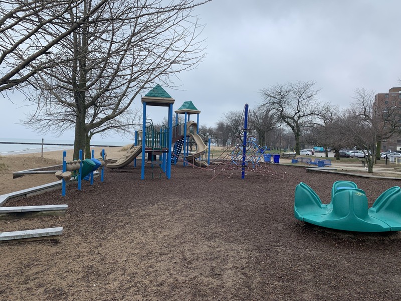 Max Pastin Playground in Lane Beach ParkThis playground - named the Max Pastin Playground - is in Lane Beach Park and features some solid playground equipment and great views of Lake Michigan. There are two play structures; the larger structure is for older children and is accessible via a ramp. There is also a standard set of Chicago Park swings: toddler, adaptive, and belt seat. The non-play amenities are solid. The play surface is soft rubber though the sand from the beach acts as a second play surface. There are a few benches and a drinking fountain and the play area is fully enclosed. This playground gets full sun in the morning and some shade in the afternoon and opens directly onto a sandy beach. All in all, a great playground; highly recommend.