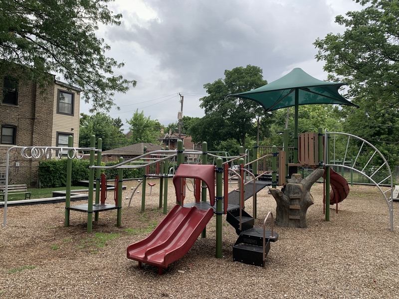 Altgeld Park - PlaygroundRenovated in 2013, this small playground is located in the northwest corner of Altgeld Park and features a large play structure designed for older children. This structure includes a few slides, climbing elements, rope bridge, and monkey bars. In a separate area, the playground also contains a small playhouse, a see-saw, and the standard set of swings. The play area is fully enclosed and the play surface is wood chips. The site has some large trees that provide some shade and a small, covered pavilion for additional shade.